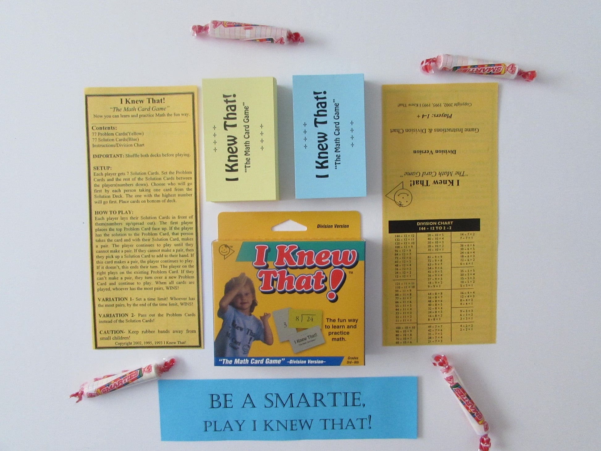 I Knew That "The Math Card Game" Division Version is for elementary school age children. These games have a problem set and a solution set of cards. Unlike flash cards, children actually match the solutions to the problems. They not only do the thought portion of it, but they actually see the solutions in front of them and match them to the problems. Instructions are included with an answer key. Each game comes with Smarties Candies, Be A "SMARTIE" Play I Knew That.